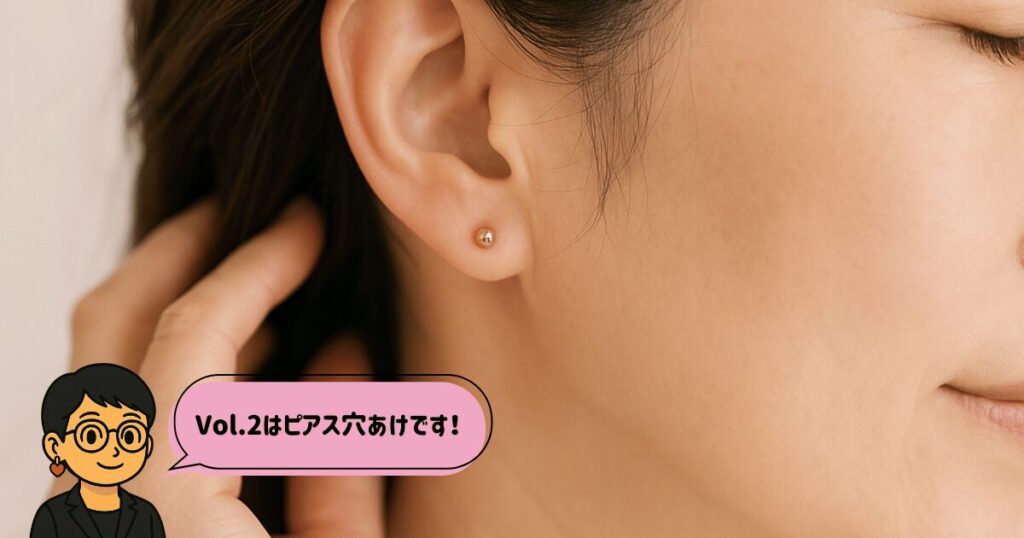 Vol2.01では、クリニックでの穴あけまでをお伝えしました。6週間でセカンドピアスに付け替える予定で、「ホールが安定すればおしゃれを楽しもう!」そう思っていた私ですが実際は思った以上に時間がかかり、もう少し“我慢の期間”が必要でした。 今回は、フ... -